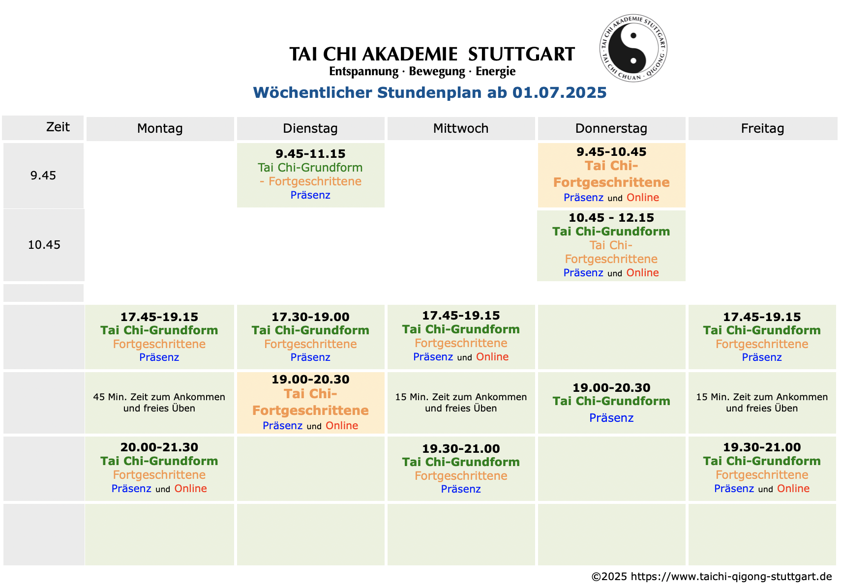 Die "Tai Chi-Grundform"-Stunden können ALLE teilnehmen, die den Formablauf des Tai Chi Chuan erlernen und vertiefen möchten. Somit sind alle Stunden, die im Plan in einem grünen Hintergrund zu sehen sind für Anfänger geeignet.